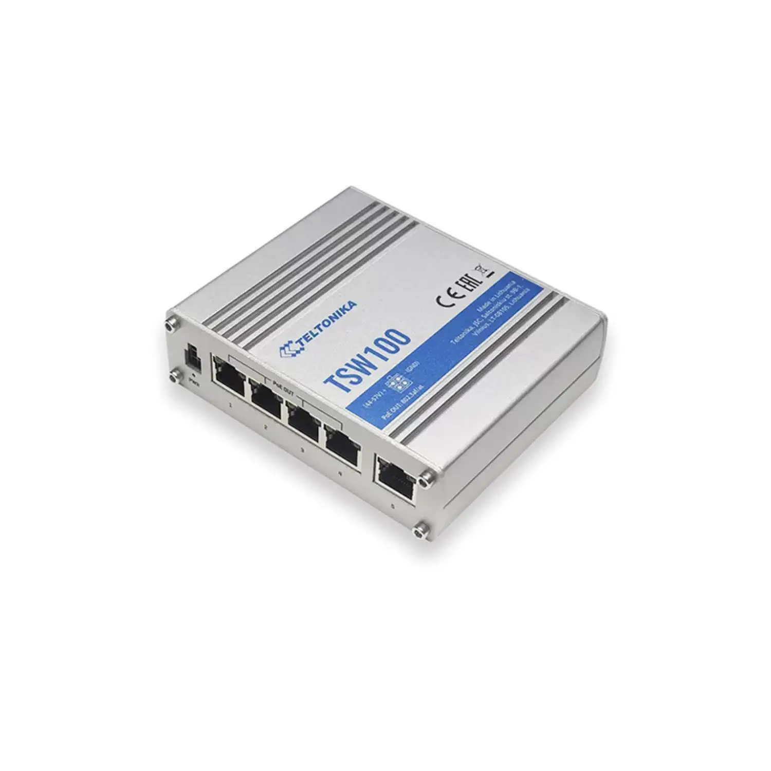 TSW100 is the first industrial unmanaged switch from Teltonika Networks.Equipped with five Gigabit Ethernet ports, four of which support IEEE802.3af and IEEE802.3at Power-over-Ethernet standards (PoE).Classified as power source equipment (PSE), it enables centralization of the power supply, providing up to 30 watts per port and reducing the effort for installing power. It has 10/100/1000 Mbps Ethernet ports for an economical high-bandwidth solution. Ideal for professional high bandwidth applications to provide both , reliable data connection and power supply.
