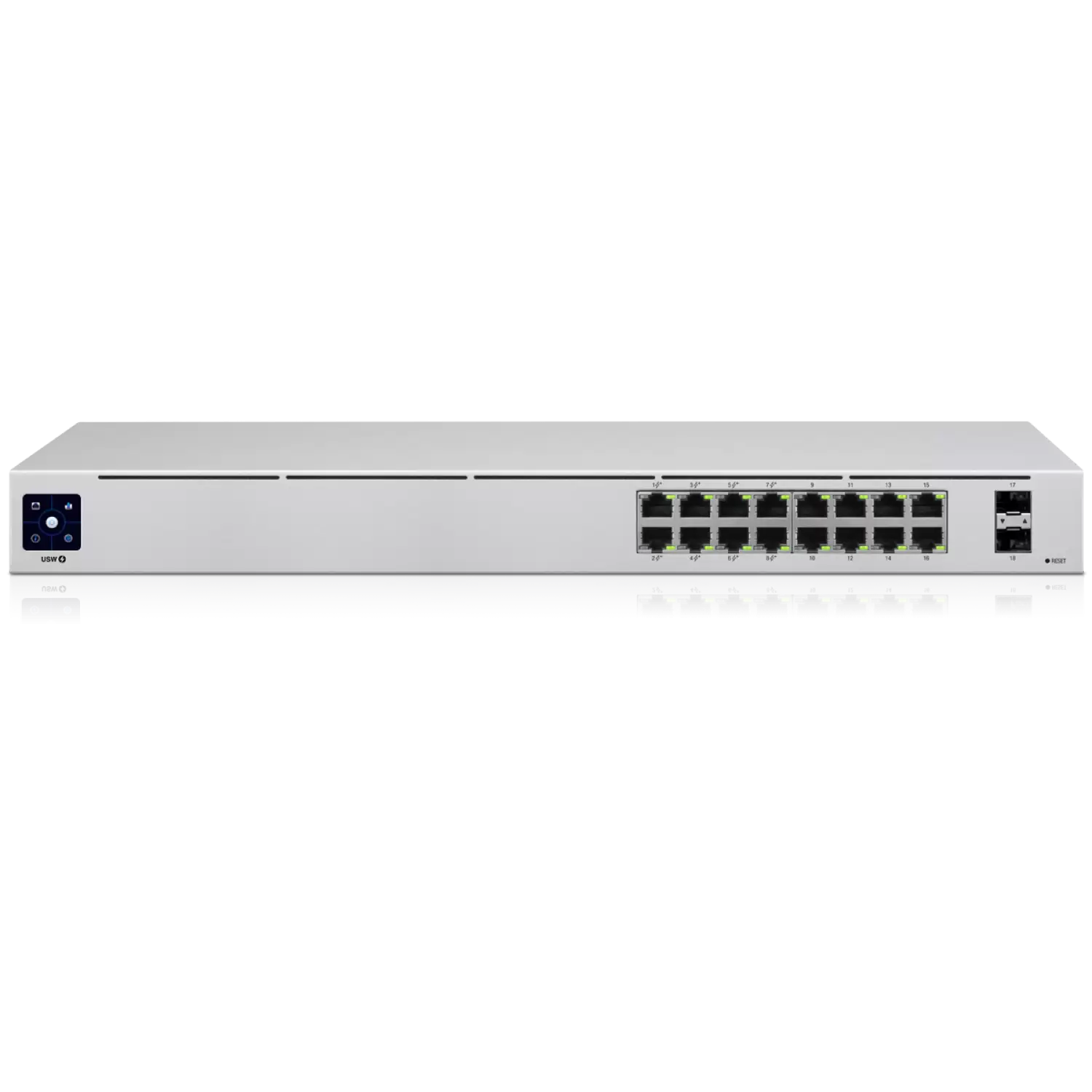 The USW-16-POE is a configurable Gigabit Layer 2 switch with sixteen Gigabit Ethernet ports including eight auto-sensing 802.3at PoE+ ports, and two SFP ports. It provides Gigabit PoE links to your RJ45 Ethernet devices and Gigabit fiber uplink options to your enterprise network.